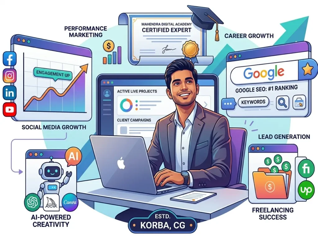 Start your journey with the best digital marketing institute in Korba. Learn SEO, social media marketing, Google Ads, Meta Ads, WordPress, and AI tools with real projects. This course is designed for students, job seekers, business owners, and beginners who want to build a high-income career in digital marketing.